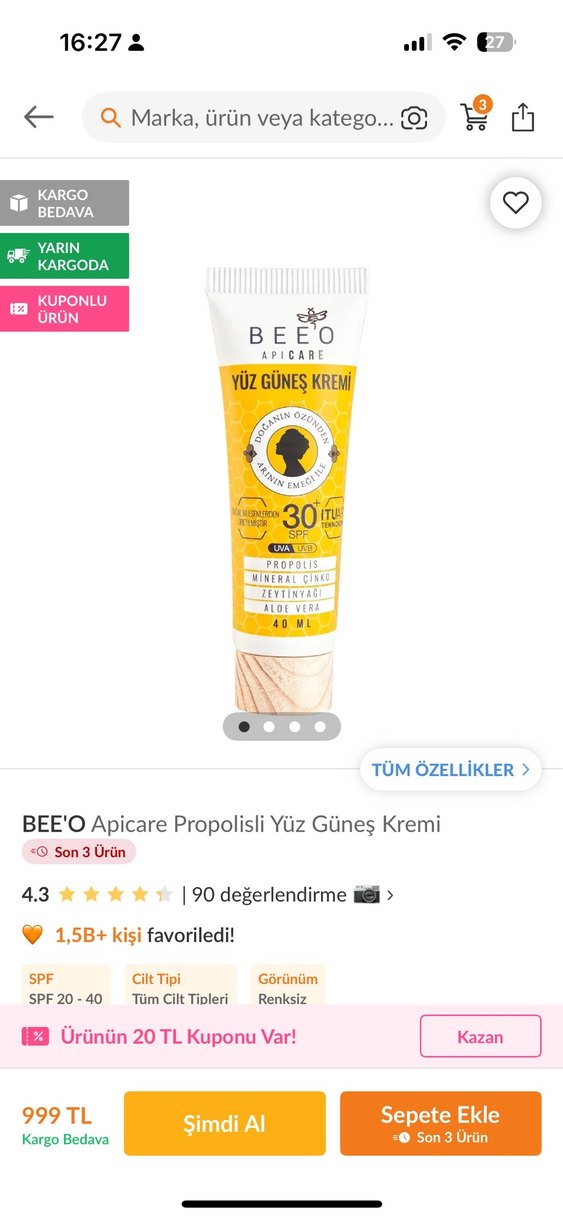 BEE'O Apicare Propolisli Yüz Güneş Kremi SPF 30, propolis, mineral kil, zeytinyağı ve aloe vera içerir. Tüm cilt tipleri için 40 ml, parlak sarı tonlu güneş koruyucudur. ☀️ bir kere denendi