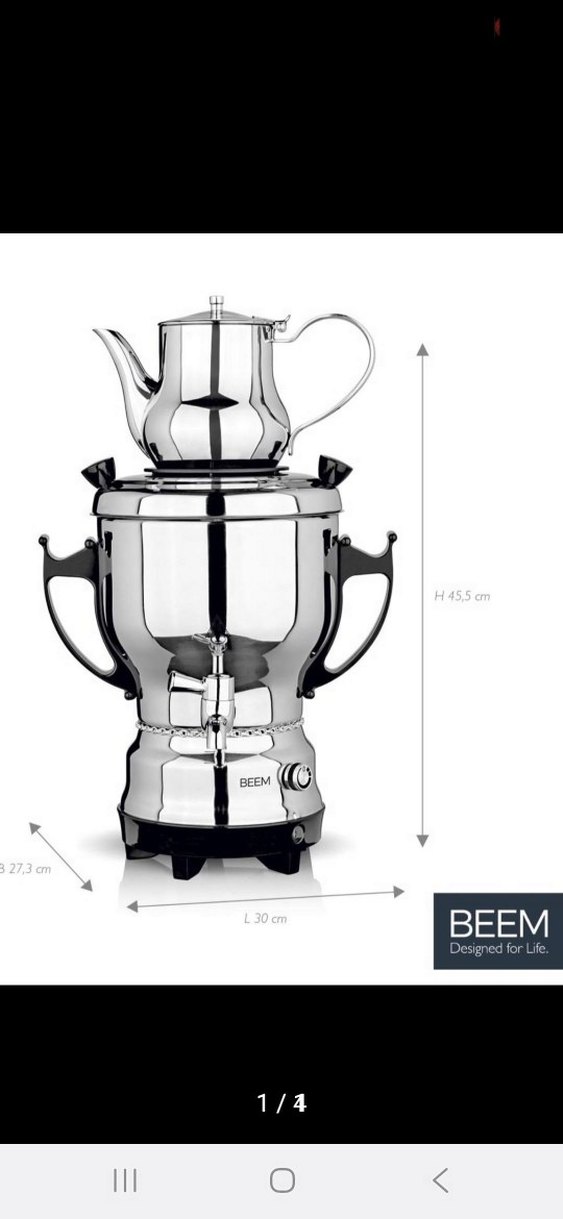 BEEM markalı gri çaydanlık seti, 45,5 cm yüksekliğinde ve 30 cm uzunluğundadır. Üstte küçük çaydanlık ve altta büyük hazne bulunur. ☕