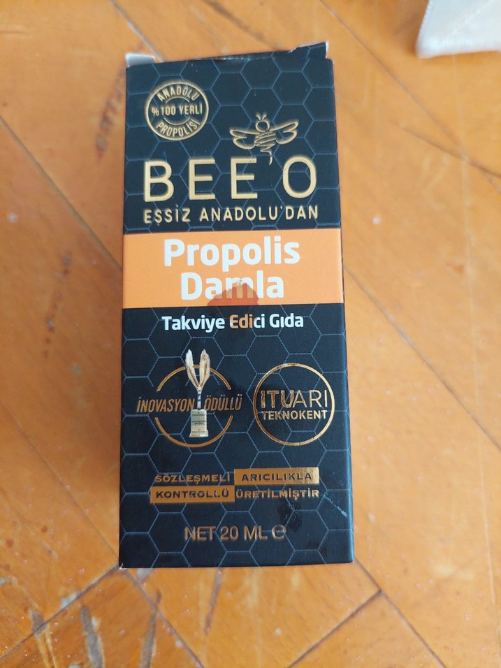 Beeo Propolis Damla 20 ml, kontrollü arıcılıkla üretilmiş takviye edici gıdadır. Koyu altın renkli kutuda, doğal sağlığı destekler. 3, 4 önce alindi yarıdan az doluluk oranli