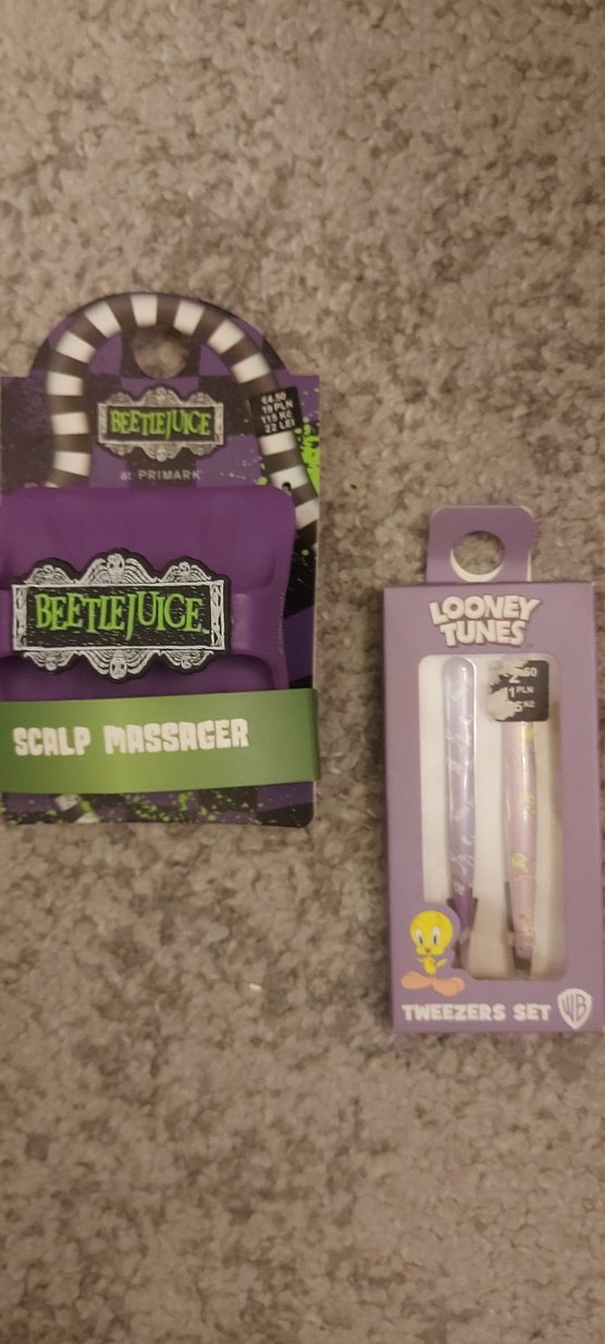 Beetlejuice temalı mor renkli, saç derisi masaj aleti ve Looney Tunes figürlü cımbız seti. İkisi beraber fiyatıdır.