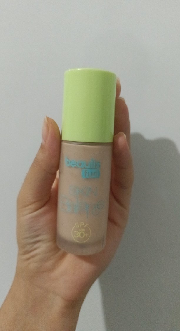 Bej fondöten, SPF 30+ koruma sağlar ve ciltte eşit bir kapatıcılık sunar. Pastel yeşil kapaklı şişede.