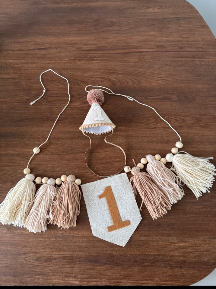 Bej renkli, 1 rakamlı küçük şapka ve püsküllerle süslenmiş doğum günü süsü seti. 2-3saat kullanıldı yeni sayılır