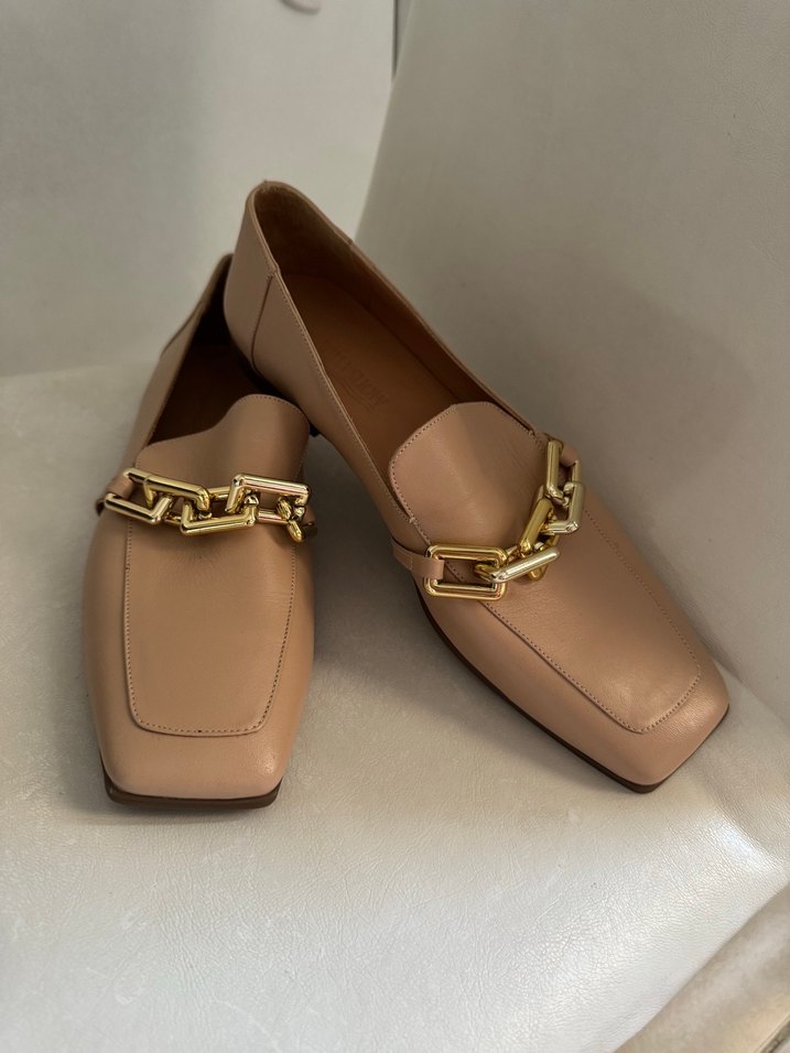 Bej renkte, deri malzemeden yapılmış, blok topuklu ve zincir detaylı kadın babet. Günlük kullanım için klasik ve çağdaş Paris tarzı sunar.