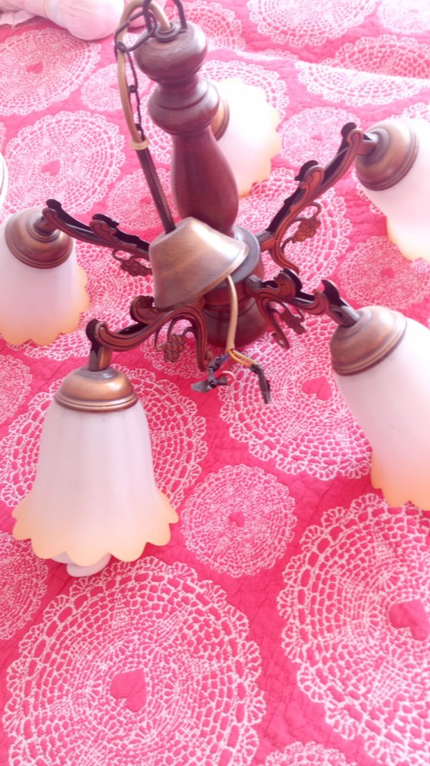 Bej renkli, beş kollu ve buzlu cam gövdeli klasik tasarım avize. ️