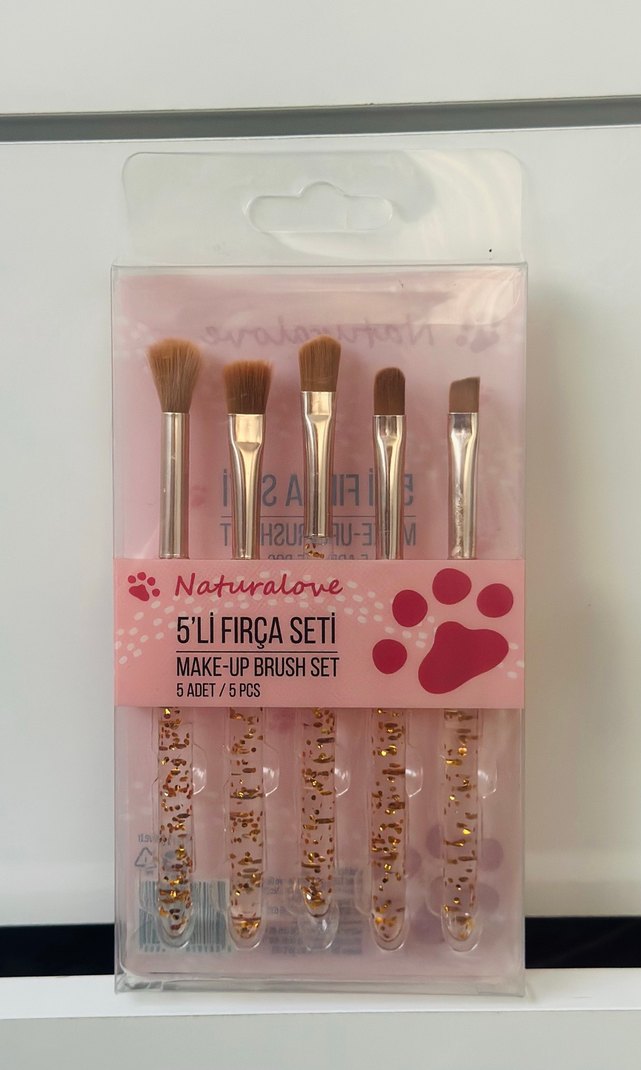 Bej renkli, altın simli saplara sahip 5'li makyaj fırça seti. Farklı makyaj uygulamaları için uygundur. ️