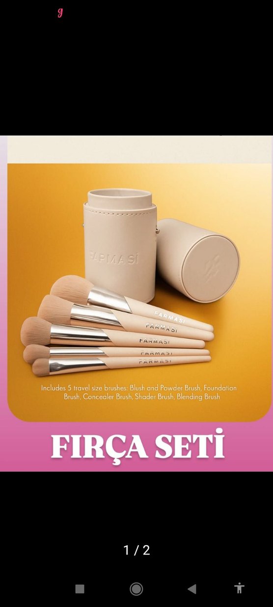 Bej renkte, 5 seyahat boyu makyaj fırçası içerir: allık ve pudra fırçası, fondöten fırçası, kapatıcı fırçası, far fırçası ve karıştırma fırçası. Silindirik kutu ile birlikte.