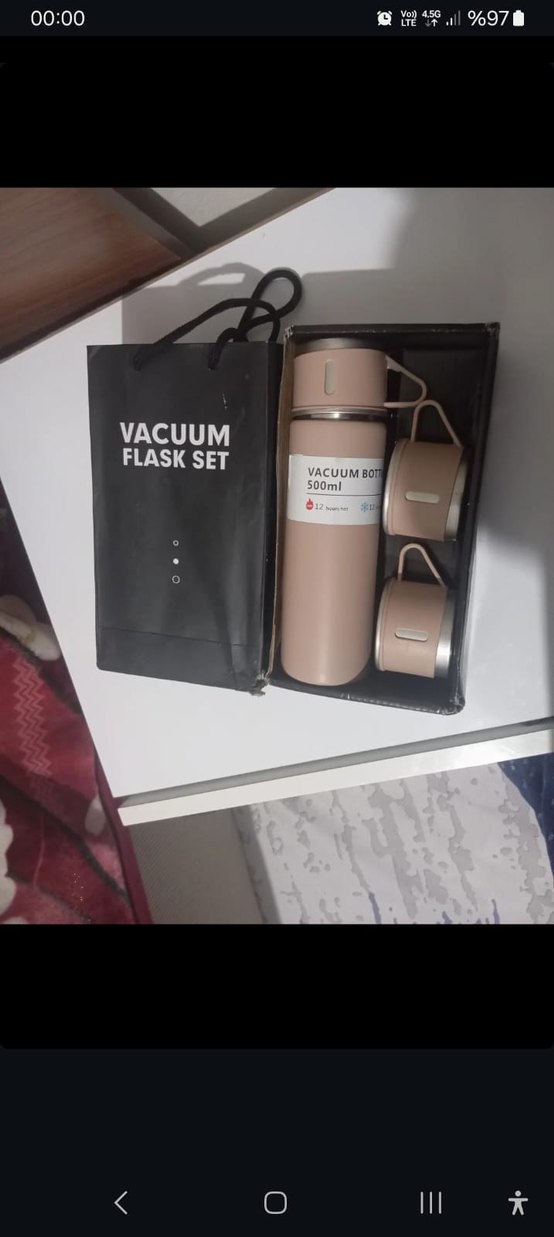 Bej renkte 500ml kapasiteli vakum termos seti, ana şişe ve iki küçük kap içerir. İçecekleri uzun süre sıcak veya soğuk tutar. Taşıması kolaydır.