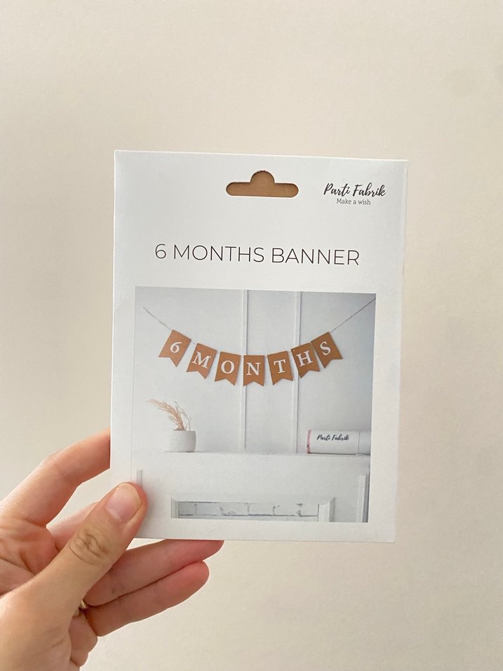 6 AY yazılı açık bej renkli parti süsleme afişi. Dayanıklı malzemeden yapılmıştır ve kutlamalara şık bir dokunuş katar.