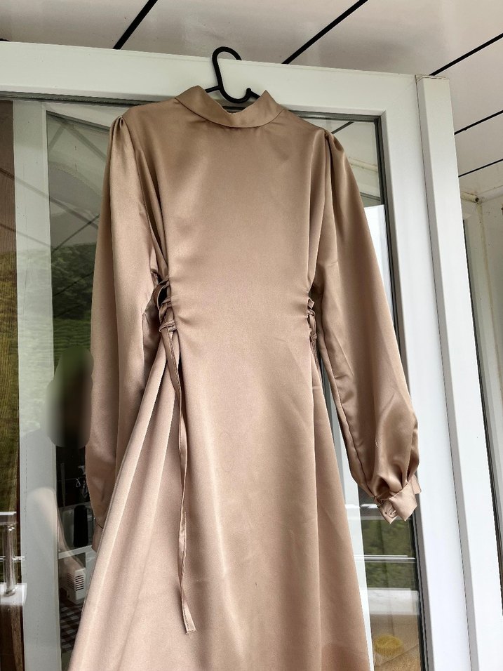 ŞALIYLA GÖNDERECEĞİM. Özel olarak diktirdim. Sadece bir kere düğün için kullandım. Çok temiz deformesi yok. Yandan bağlanabilir ipli, o yüzden L bedene kadar kullanılabilir.