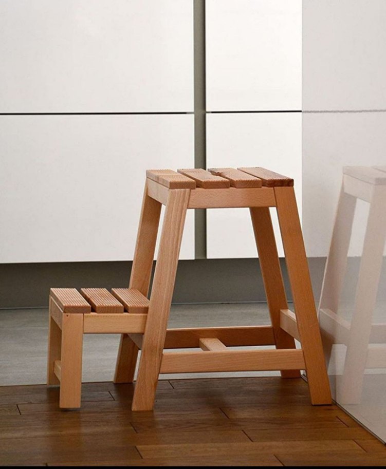 Bej renkte, desen içermeyen ahşap basamak taburesi. İki basamaklı ve sağlam yapıya sahiptir, iç mekan kullanımı için uygundur.