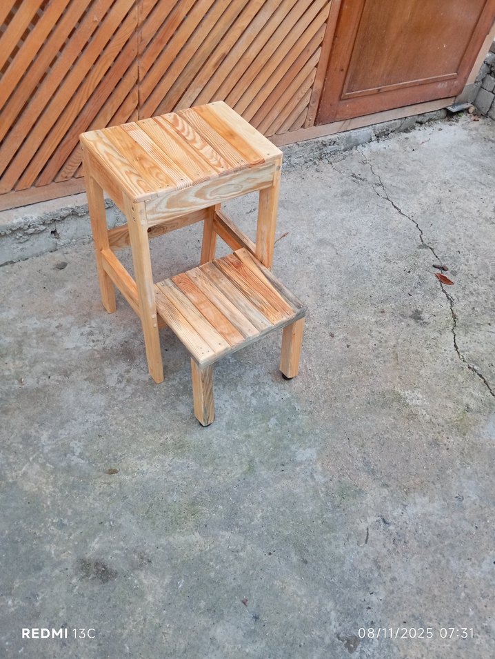 İki seviyeli, dayanıklı bej ahşap basamak taburesi. Desensiz, sade tasarım.