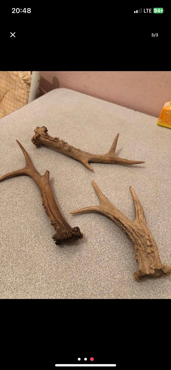 Doğal dokulu, koyu bej renkte, detaylı tasarımlı üç adet ahşap oyuncak boynuz seti. Her parça benzersiz şekle ve rustik görünüme sahip.
