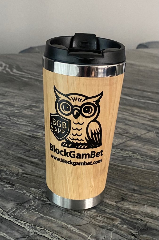 Bej renkte, ahşap görünümlü seyahat termosu. Siyah kapaklı ve açılır kapanır mekanizmalı. Üzerinde siyah baykuş logosu ve "BlockGamBet" yazısı bulunur.