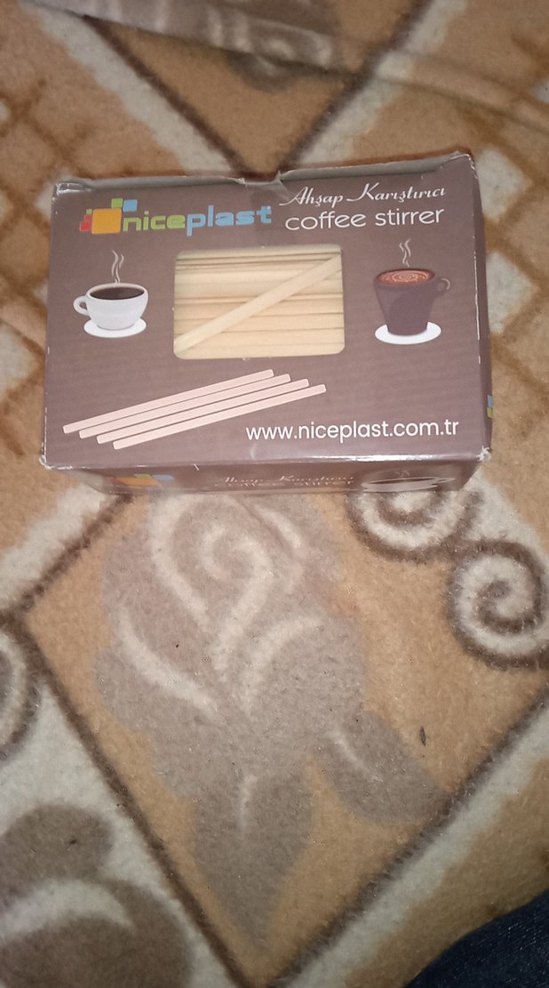Bej renkli, ahşaptan yapılmış kahve karıştırıcılar. Kutuda www.niceplast.com.tr adresi yer alıyor. ☕