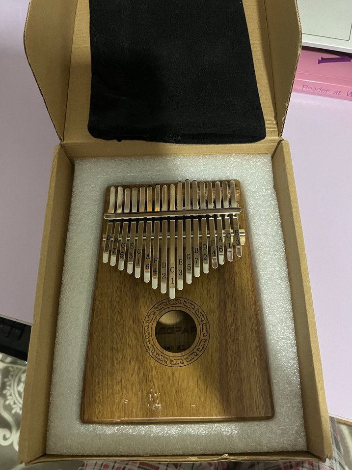 Koyu bej renkte ahşap kalimba, üzerinde not işaretli metal dilciklere ve siyah taşıma çantasına sahiptir.
