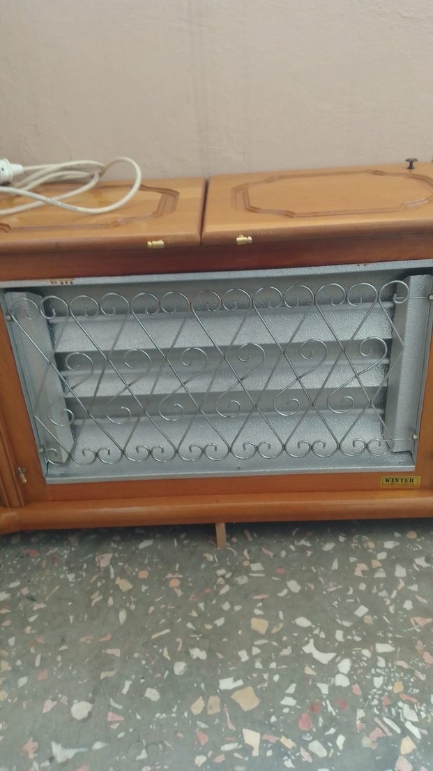 Ahşap kapaklı, metal ızgaralı bej renkli elektrikli ısıtıcı. Kompakt tasarım, iç mekan kullanımı için uygundur. önünde kapakları mevcut hiç bir sorunu yoktur sadece ön tekerleği kırık değişebilir