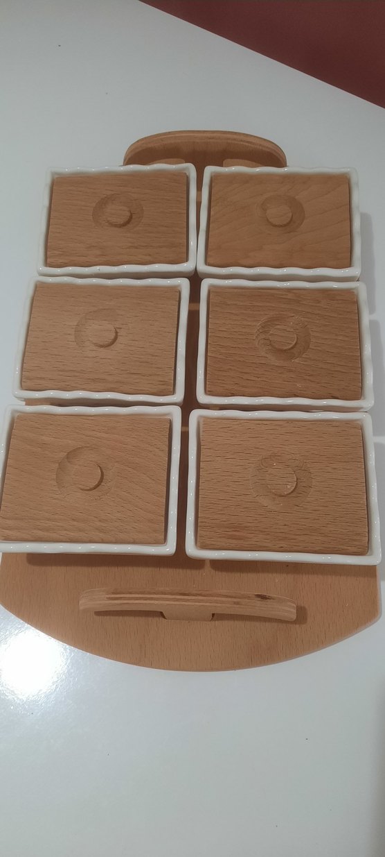 Bej renkli tahta üzerinde anşap kapaklı 6 kap bulunur, kahvaltılık olarak kullanabiliyor
