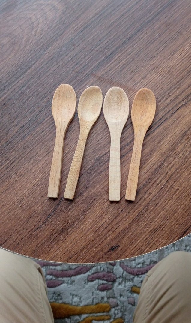 Dört adet açık bej renkte, pürüzsüz yüzeyli ahşap kaşık seti, çeşitli mutfak kullanımları için uygun.