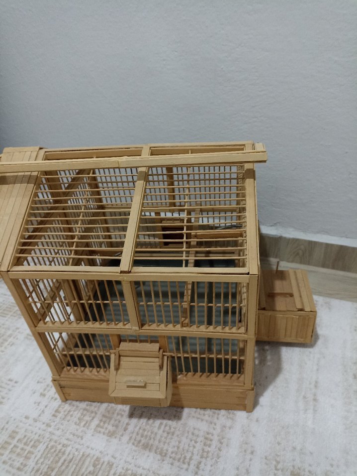 Bej renkte ahşaptan yapılmış, küçük kapılı klasik tasarımlı kuş kafesi. Hafif ve küçük kuşlar için uygundur.