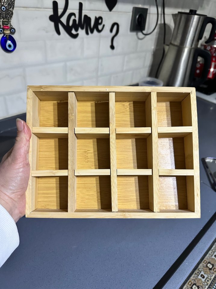 Çok bölmeli, açık bej renkte ahşap makyaj düzenleyici. Kozmetiklerin düzenli saklanmasını sağlar.