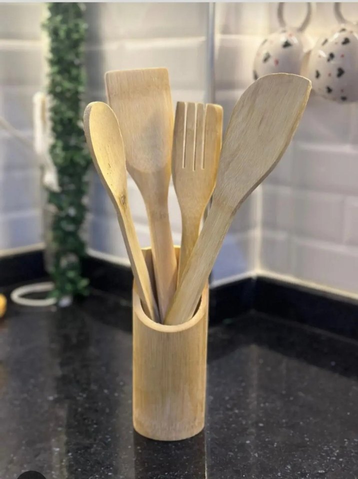 Bej renkte, ahşaptan yapılmış mutfak gereçleri seti, uyumlu bir tutucuda saklanmaktadır.