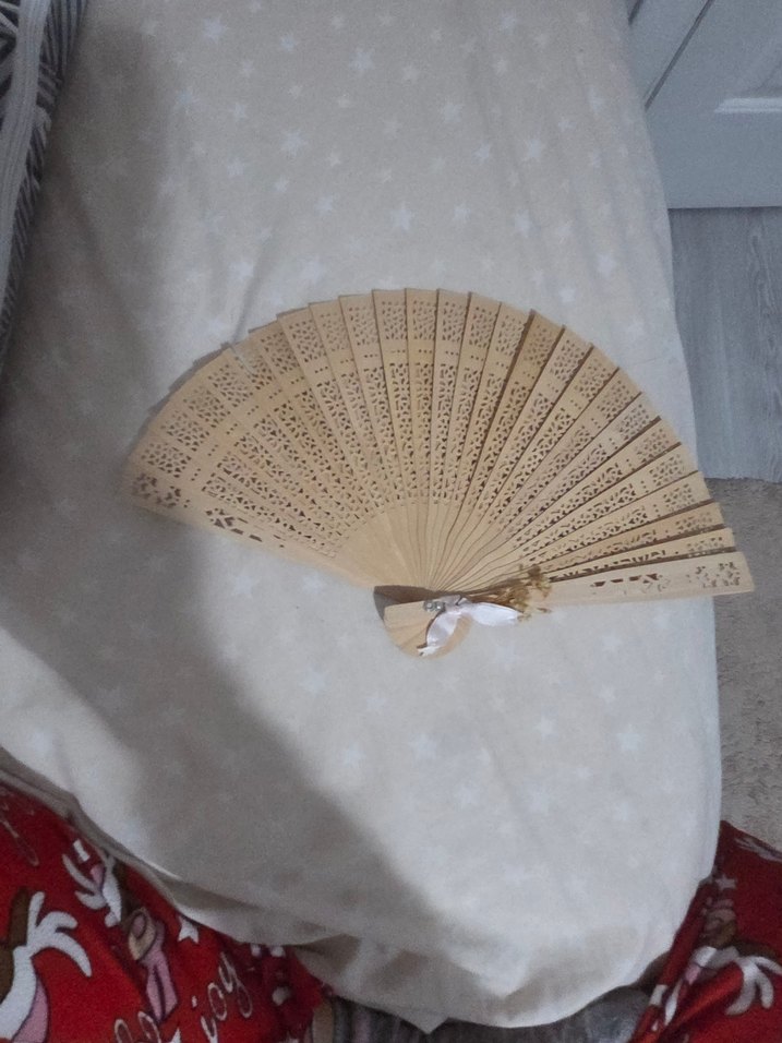 Bej renkte, oyma detaylı ve kumaş süslemeli hafif ahşap yelpaze
