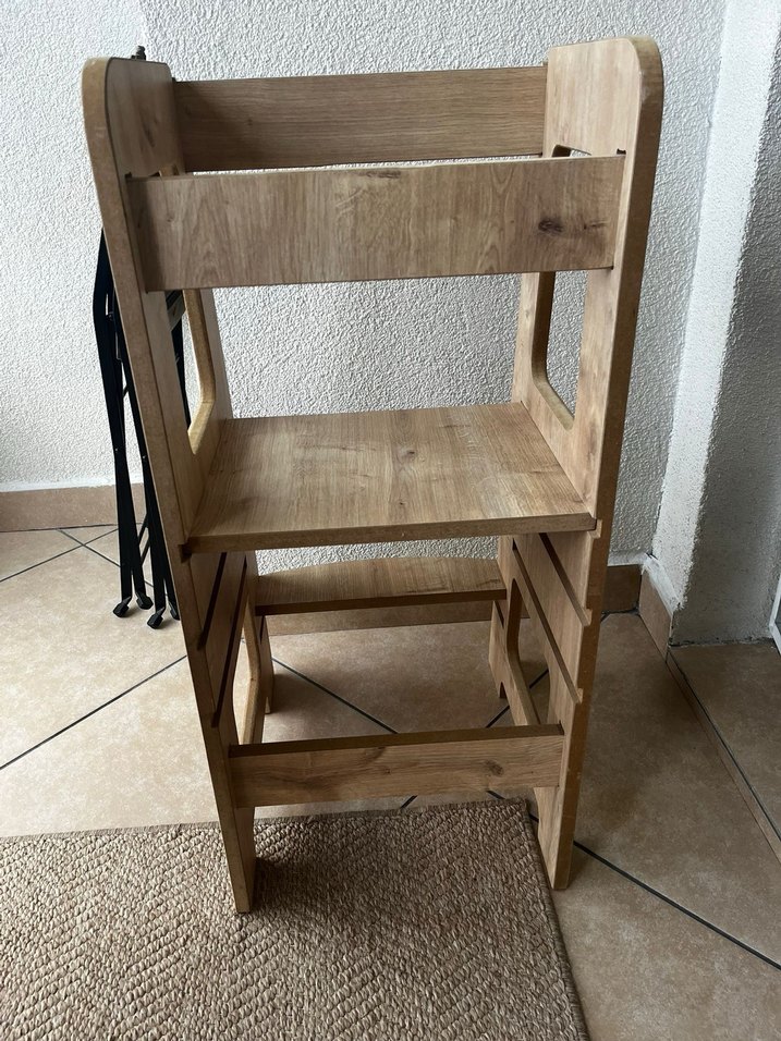 Bej renkte, doğal ahşaptan yapılmış çocuk sandalyesi, sağlam yapısı ile güvenli oturma imkanı sunar.
