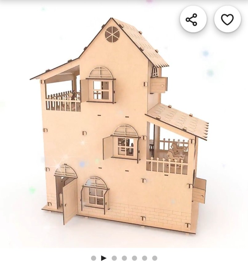 Bej renkte, çok katlı pencereleri ve balkonları olan ahşap oyuncak evdir. Ham ahşaptan yapılmıştır. Özel CNC kesim yapılır.Cocuklarla kurabilir ve boyanabilir.