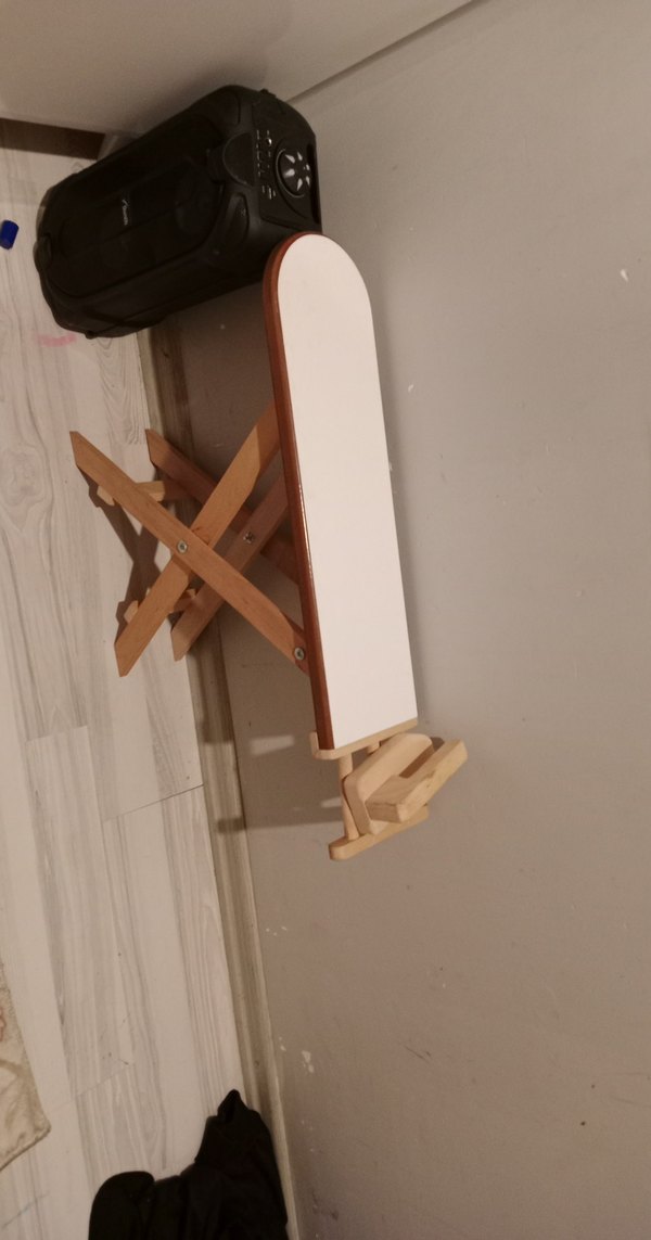 Bej renkte, katlanabilir ayaklı ve pürüzsüz yüzeye sahip dayanıklı ahşap oyuncak kaykay.