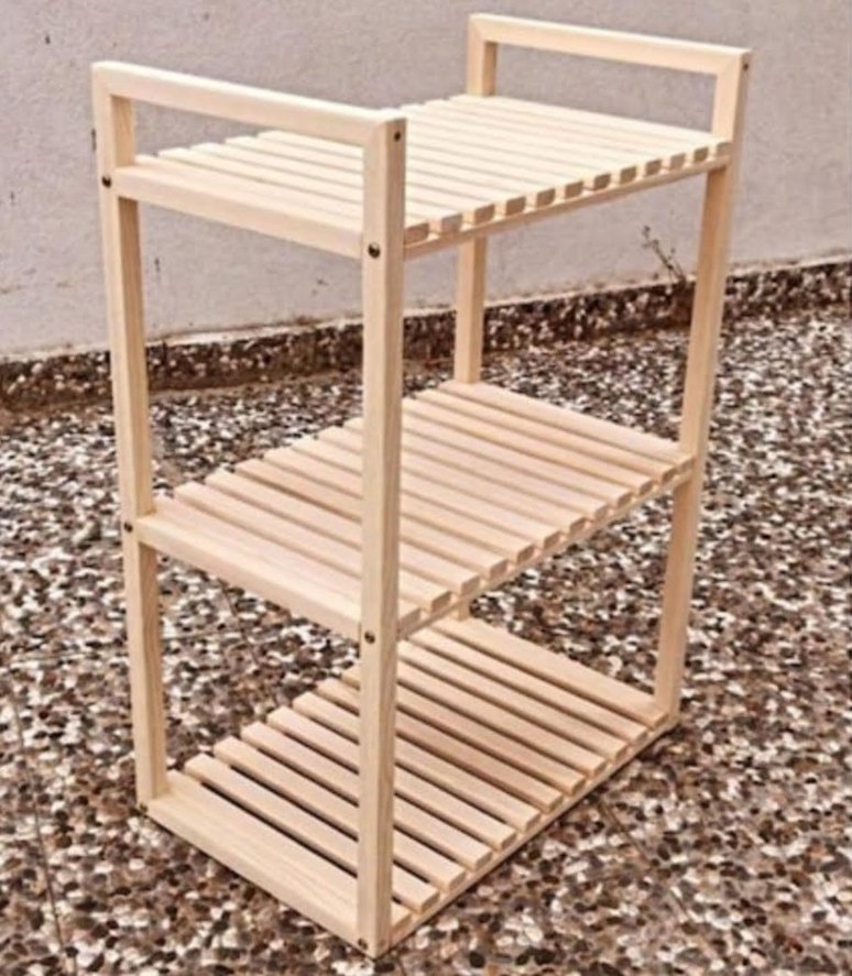 Bej renkte üç katlı ahşap raflı dolap düzenleyici, depolama ve erişim kolaylığı sağlar. Hafif renk ve sade tasarıma sahiptir.