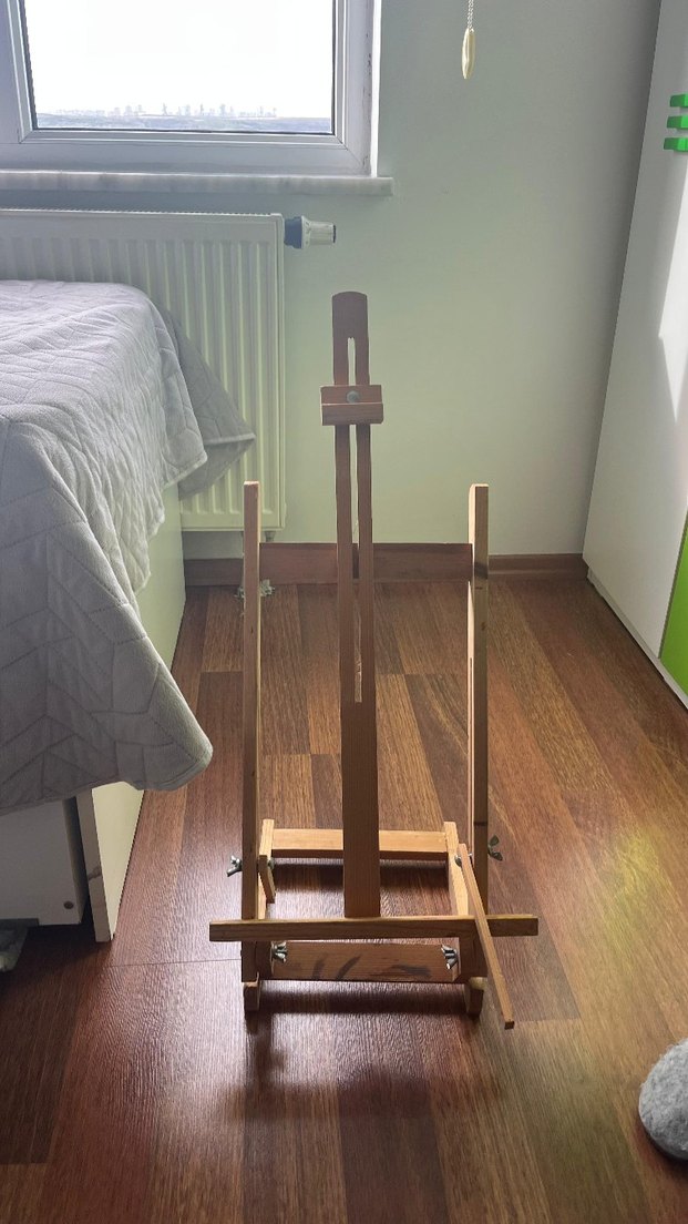 Bej renkte, ayarlanabilir kollar ve sağlam tabana sahip ahşap sanat çalışma standı. Tuval veya çizim tahtası tutmak için uygundur.