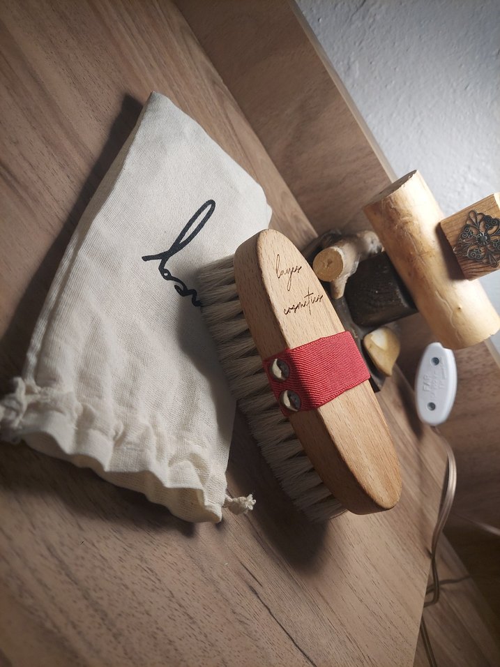 Ahşap saplı, yumuşak kıllı bej at kılı, tutuş için kırmızı kayış ve saklama için kumaş kılıf içerir.