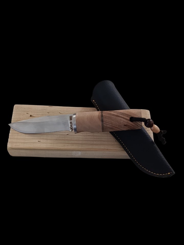 Bej ahşap saplı, keskin metal bıçak ve siyah deri kılıf.