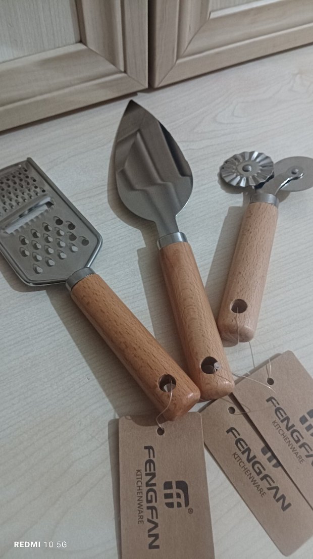 Bej ahşap saplı rende, pasta sunucu ve hamur kesici içeren mutfak seti. Paslanmaz çelik başlıklar ve FENG marka etiketler.