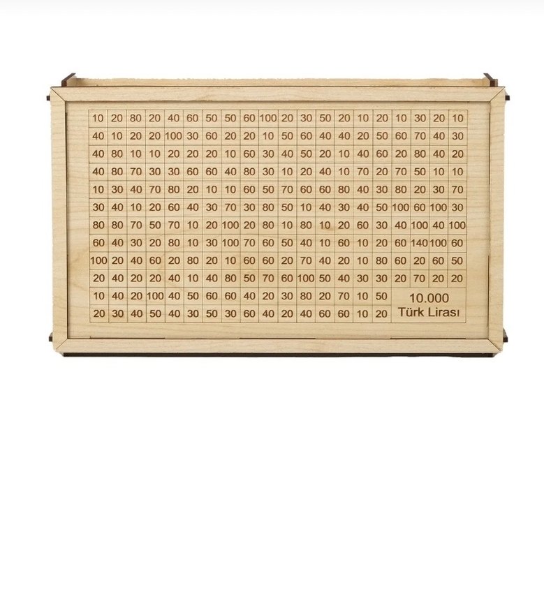 Bej renkli ahşap puzzle, 10.000 Türk Lirası dahil sayılarla dolu bir tablo şeklindedir. Doğal ve pürüzsüz ahşaptan yapılmıştır.