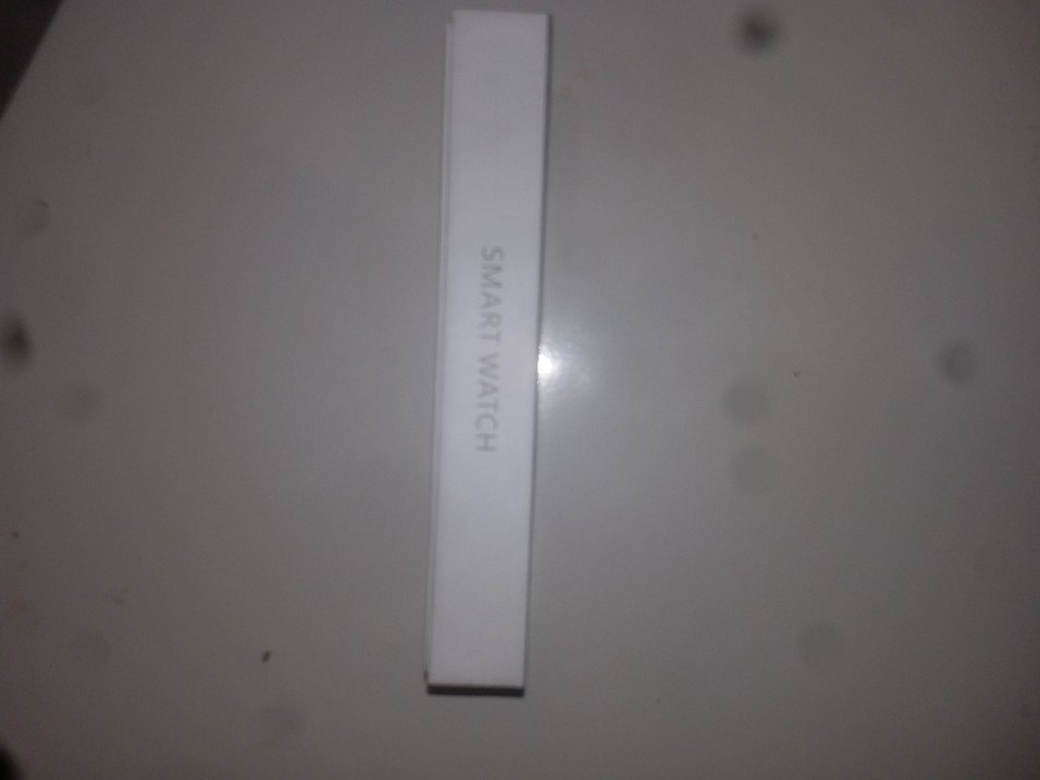 Gri detaylı, bej renkli ince tasarımlı akıllı bileklik. Kutusu üzerinde SMART WATCH yazısı bulunur. ⌚