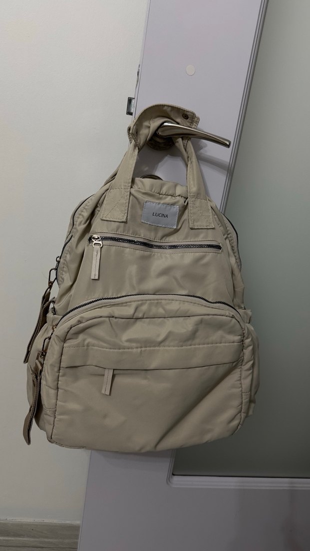 Bej renkte, fermuarlı bölmelere sahip anne bebek sırt çantası. Çok gözlü kullanışlı ve sentetik kumaştan üretilmiştir. Günlük kullanıma uygun, trend görünümlü.