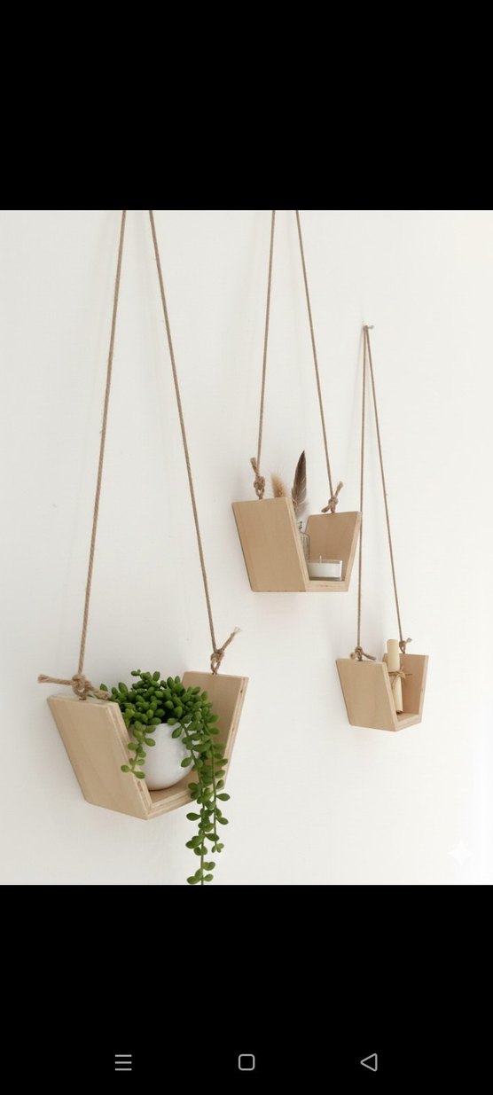ham ahşap İp detaylı, küçük bitkiler ve dekoratif eşyalar için bej asılı ahşap saksılık seti. Ev dekoruna doğal bir dokunuş katar.