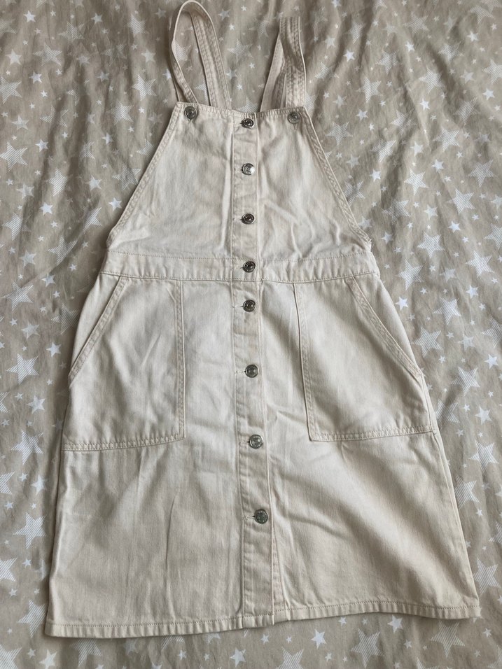 Düğmeli, denim kumaştan, bej renkli, askılı elbise. Bol kesim ve bohem tarzda, rahat bir görünüme sahiptir.