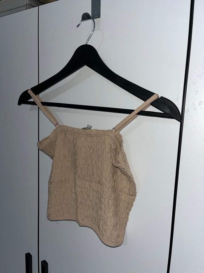Bej renkte ince askılı az kullanılmış crop koton marka.