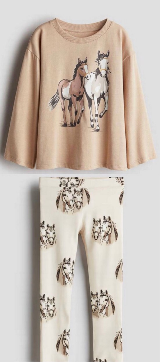 Uzun kollu bej üstünde at figürü ve at desenli tayt içeren bebek kız takımı. Orjinal marka , etiketsiz.