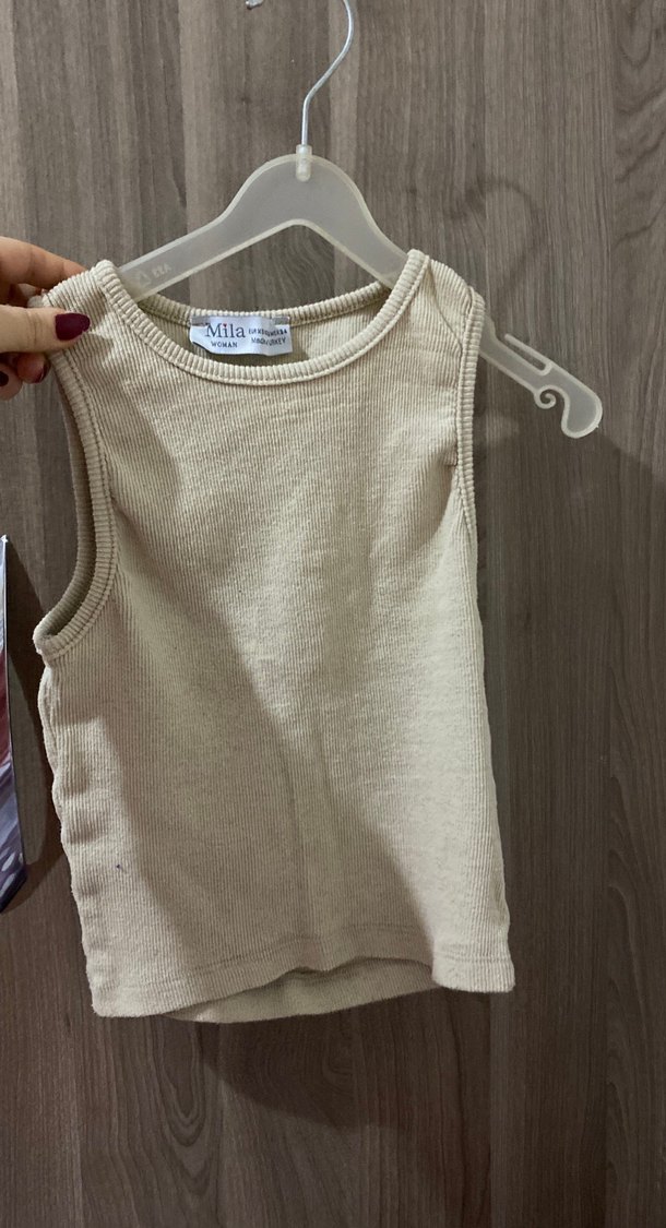 Yumuşak, rahat kumaştan yapılmış bej renkli desensiz atlet. Crop Üst üste giymek için uygundur.