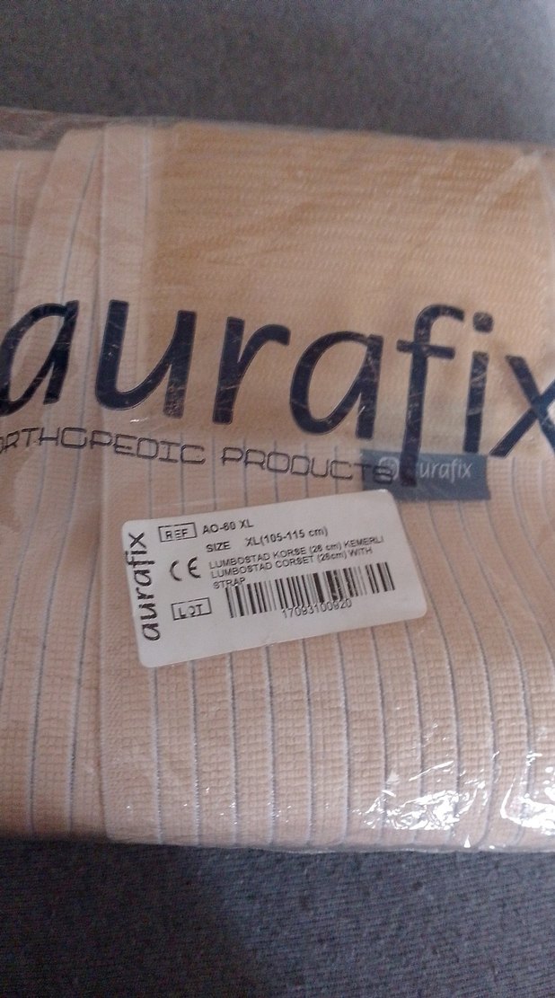 Bej renkli Aurafix ortopedik lomber destek, ayarlanabilir kayışlı, XL beden (105-115 cm). CE sertifikalı.