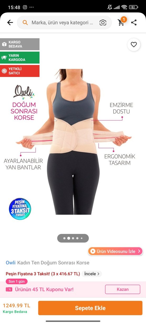 Bej renkte, ayarlanabilir yan bantlara ve ergonomik tasarıma sahip doğum sonrası korse. Kısa boy ve vücuda oturan kesimlidir. yeni dir hiç takmadm