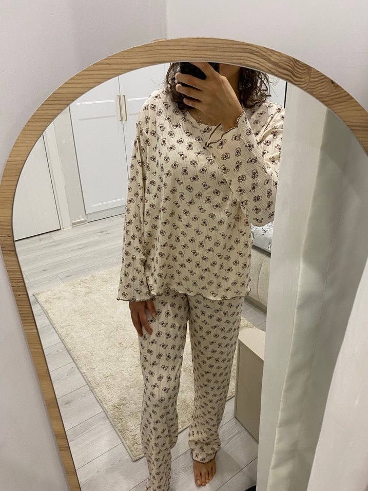 Bej renkli, ayıcık desenli, uzun kollu ve rahat kesim pijama takımı, midi boyda ve sokak modasına uygun.