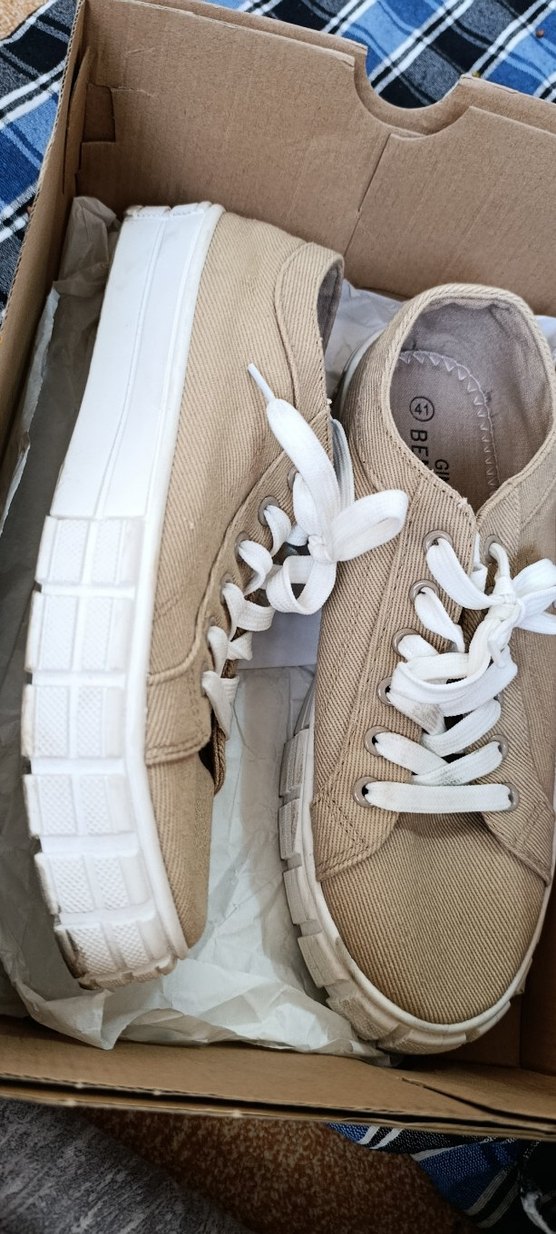 Bej renkte, bağcıklı ve dolgu topuklu spor ayakkabısı. Beyaz bağcık ve kauçuk taban kullanılmış, günlük rahat kullanım için uygun.