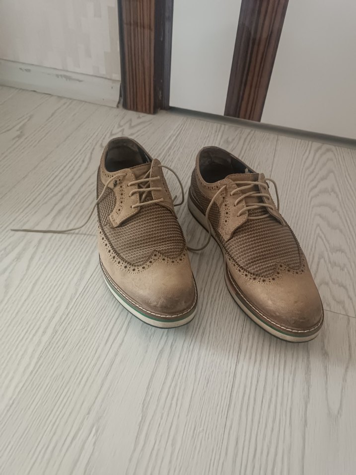 Bej bağcıklı erkek klasik ayakkabısı. beyaz detaylı tabanıyla gündelik kullanıma uygun sade tasarım.