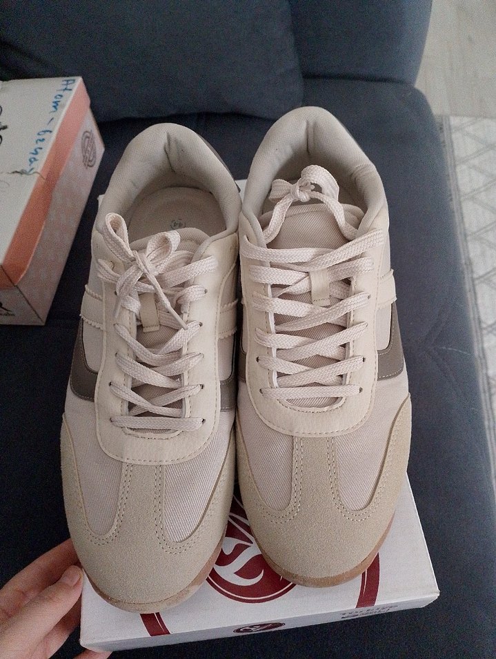 Bej renkte, bağcıklı erkek spor ayakkabı defosu yok bi defa kullanıldı