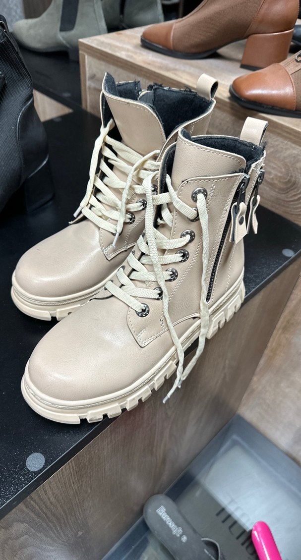 Bej renkli, Bağcıklı tasarımı ve yan fermuar detayları ile dolgu topuklu, günlük kullanıma uygun.