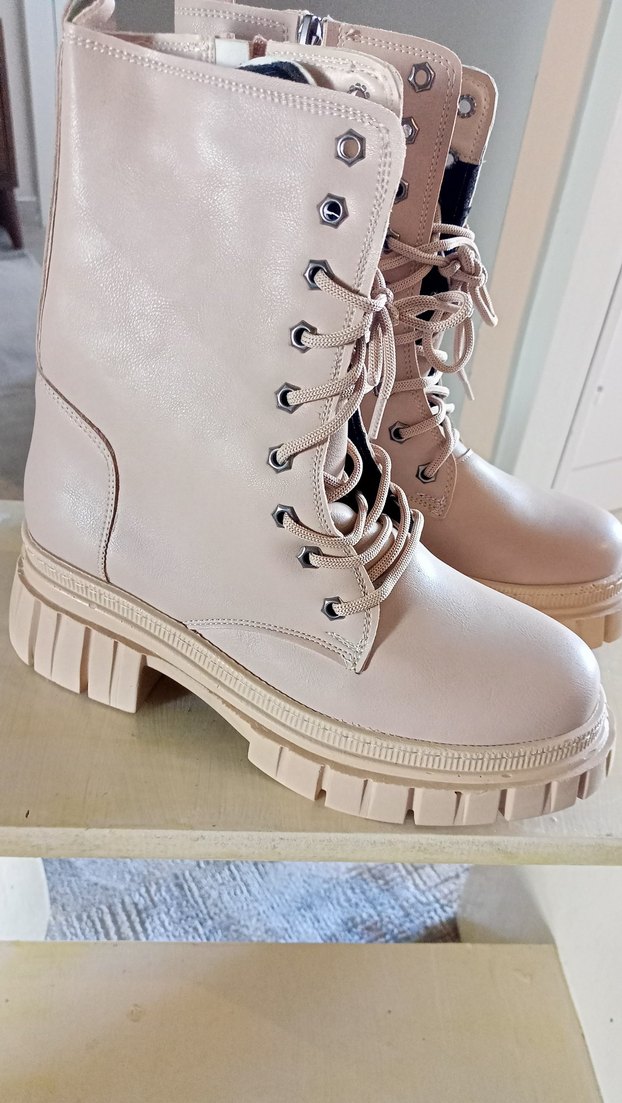 Bej renkli, blok topuklu ve bağcıklı deri botlar. Sokak stiline uygun, günlük kullanıma ideal, pastel tonlarda ve desensiz.